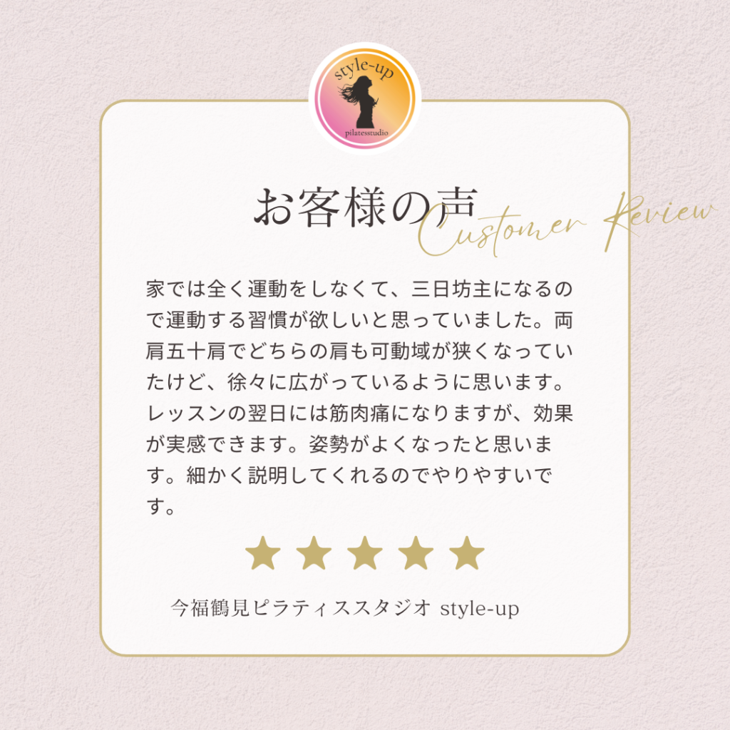 三日坊主になるので運動する週間が欲しいと思っていました。 2026 1/09 お客様の声 2026年1月9日 お客様の声 よかったらシェアしてね! URLをコピーする URLをコピーしました! URLをコピーしました! 深く呼吸をする事が多くなり以前より姿勢がよくなったと思います。 歩きやすくなり、少しお尻がひきしまってきた気がします。 関連記事 歩く時の意識が変わりました。 2026年1月9日 運動は苦手で不安もありましたが一度行ってみよう!と思いました。 2026年1月9日 近くで探していたのですぐに決めました。 2026年1月9日 日常の動きの時に意識してお腹に力をいれるようになりました。 2026年1月9日 以前より体力がついて動きやすくなった気がします。 2026年1月9日 歩きやすくなり、少しお尻がひきしまってきた気がします。 2026年1月9日 深く呼吸をする事が多くなり以前より姿勢がよくなったと思います。 2026年1月9日 初めてのマシンピラティスでも楽しく出来ました! 2026年1月9日