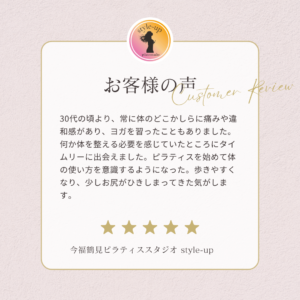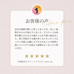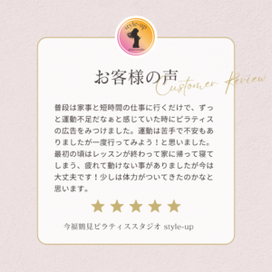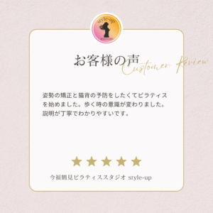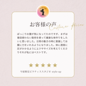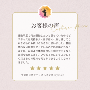 ピラティスをやり始めてからウエストが細くなり、スカートがブカブカになりました。 2026 1/09 お客様の声 2026年1月9日 お客様の声 よかったらシェアしてね! URLをコピーする URLをコピーしました! URLをコピーしました! 大阪市鶴見区区民センター グループレッスン 初めてのマシンピラティスでも楽しく出来ました! 関連記事 歩く時の意識が変わりました。 2026年1月9日 運動は苦手で不安もありましたが一度行ってみよう!と思いました。 2026年1月9日 近くで探していたのですぐに決めました。 2026年1月9日 日常の動きの時に意識してお腹に力をいれるようになりました。 2026年1月9日 以前より体力がついて動きやすくなった気がします。 2026年1月9日 歩きやすくなり、少しお尻がひきしまってきた気がします。 2026年1月9日 三日坊主になるので運動する週間が欲しいと思っていました。 2026年1月9日 深く呼吸をする事が多くなり以前より姿勢がよくなったと思います。 2026年1月9日